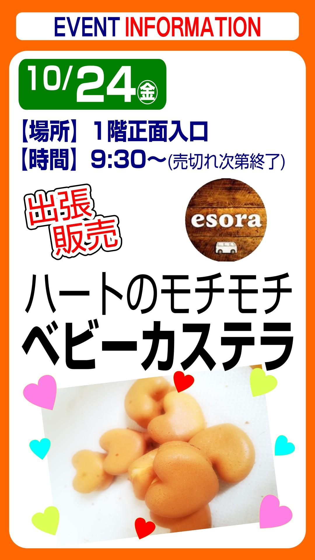 esora ベビーカステラ【出張販売】 2025.10.24 米粉を使ったモチモチのベビーカステラです。売り切れ次第終了ですので、この機会にぜひご賞味ください。 日 時 10月24日(金)9:30~ 売り切れ次第終了 場 所 1階 正面入口