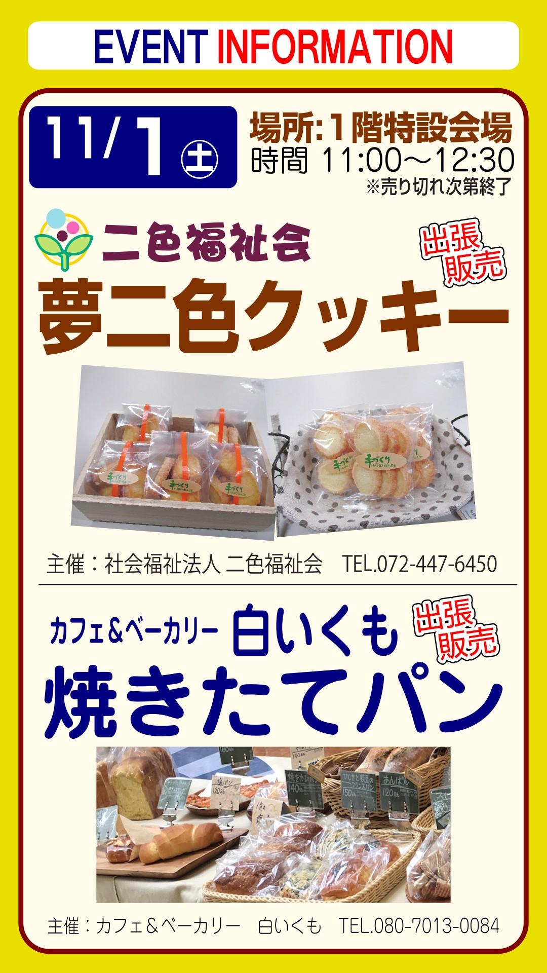 二色福祉会「夢二色クッキー」と白いくも「焼きたてパン」の出張販売です。