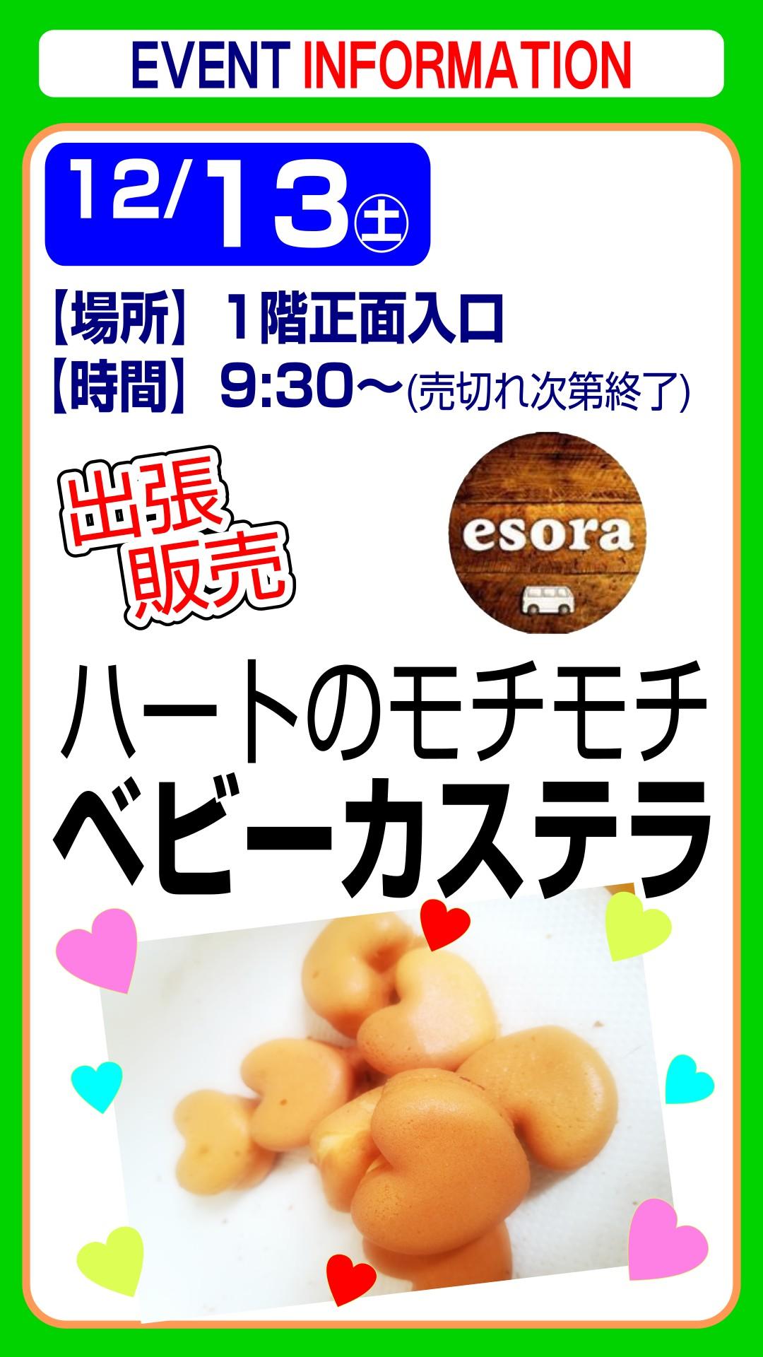 esora ベビーカステラ【出張販売】 2025.12.13 米粉を使ったモチモチのベビーカステラです。売り切れ次第終了ですので、この機会にぜひご賞味ください。 日 時 12月13日(土)9:30~ 売り切れ次第終了 場 所 1階 正面入口