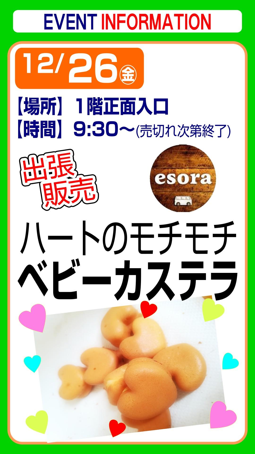 esora ベビーカステラ【出張販売】 2025.12.26 米粉を使ったモチモチのベビーカステラです。売り切れ次第終了ですので、この機会にぜひご賞味ください。 日 時 12月26日(金)9:30~ 売り切れ次第終了 場 所 1階 正面入口