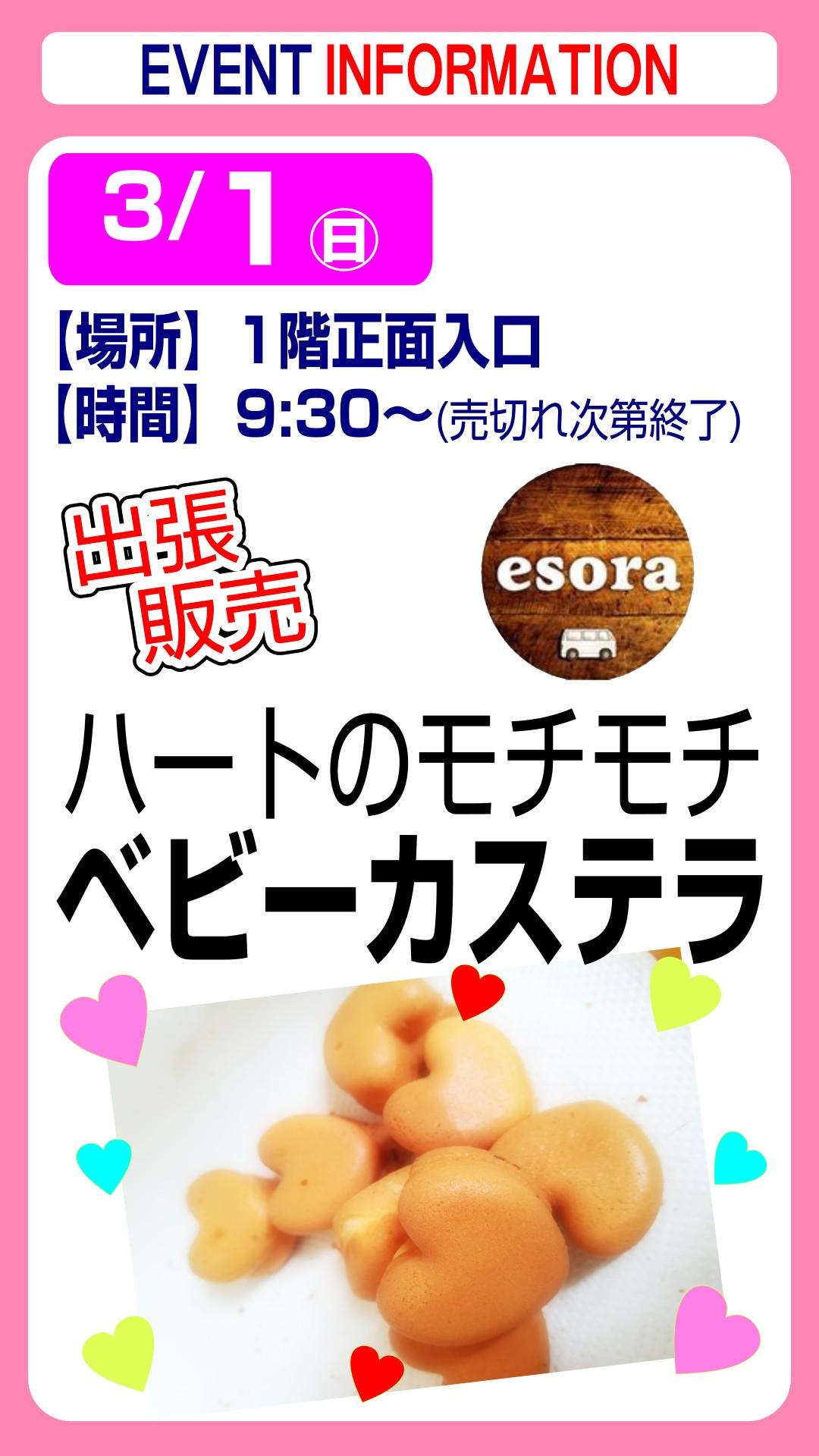 esora ベビーカステラ【出張販売】 2026.03.01 米粉を使ったモチモチのベビーカステラです。売り切れ次第終了ですので、この機会にぜひご賞味ください。 日 時 3月1日(日)9:30~ 売り切れ次第終了 場 所 1階 正面入口