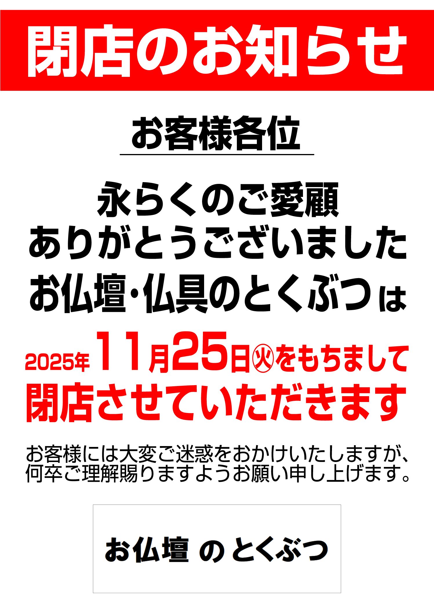 【閉店のお知らせ】1階 お仏壇・仏具のとくぶつ 平素より当店をご利用いただき、誠にありがとうございました。誠に勝手ながら、当店は11月25日(火)をもちまして閉店させていただきます。これまで賜りました皆様のご支援とご愛顧に、心より感謝申し上げます。